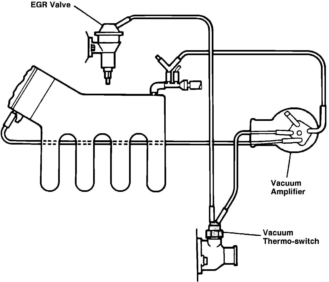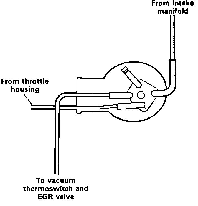 The vacuum amplifier receives two vacuum inputs. The primary input is directly from the intake manifold and the secondary input is from the throttle body (ported vacuum) before the throttle plates. The primary vacuum input is used to operate the EGR valve, while the secondary input is used as a control reference. For examine, when the vacuum inputs are equal, such as during wide open throttle, the EGR valve will close, allowing peak engine performance. The EGR valve should be open only during part throttle operation.