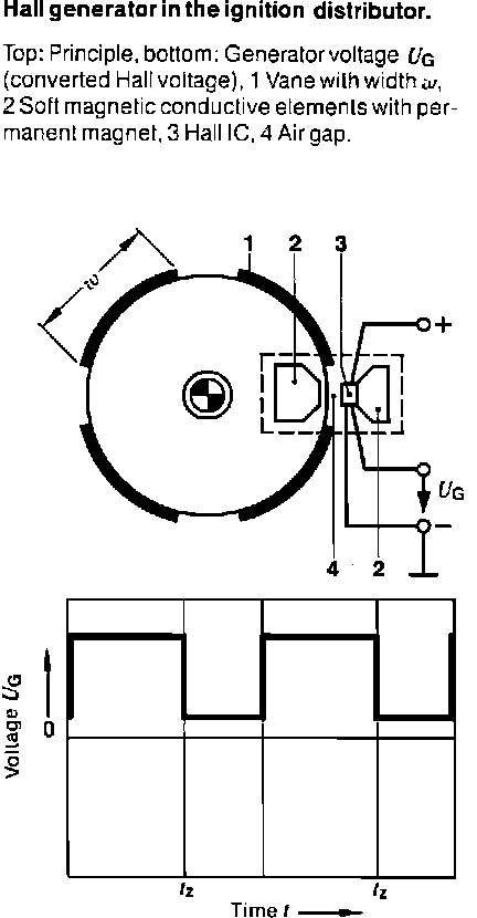 It consists of a semiconductor wafer element, and a permanent magnet. A rotating shutter called the trigger wheel acts as a switching device to produce an "ON", "OFF", signal for ignition control.