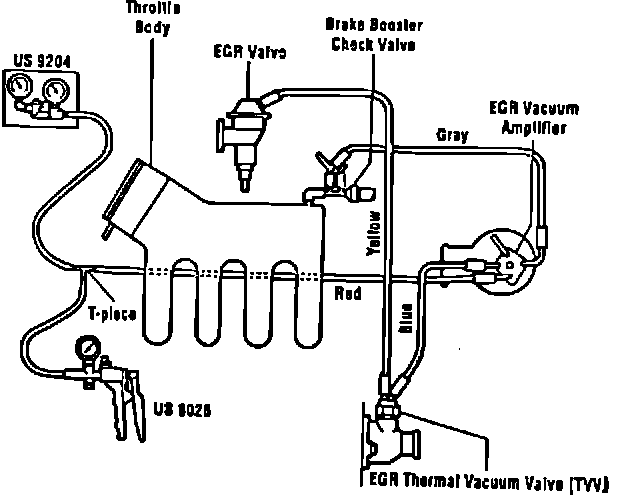 - Connect vacuum test gauges between EGR vacuum amplifier and blue line to EGR thermal vacuum valve (EGR TVV), using the supplied T-piece.