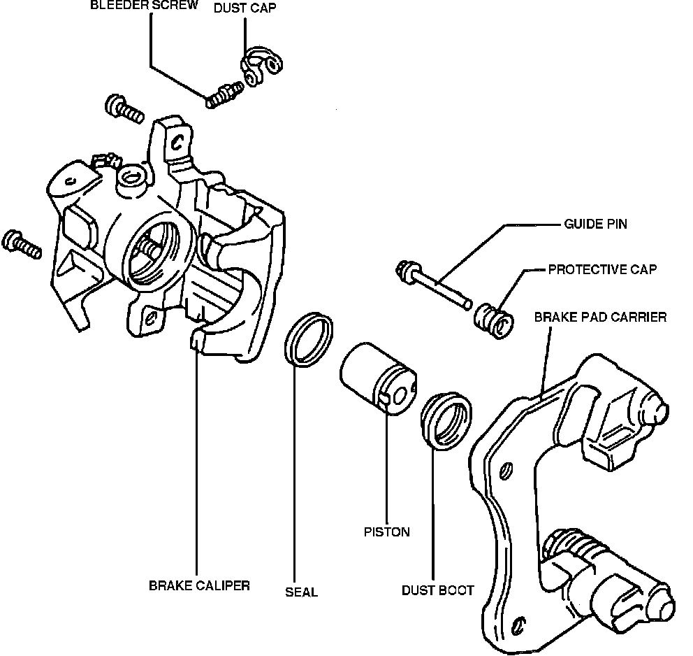 2. Remove piston seal from caliper piston bore using a plastic rod. If either caliper piston or caliper piston bore is corroded, pitted or scored, affected part must be replaced.