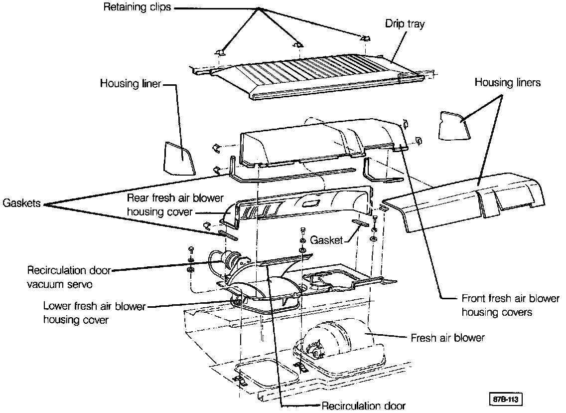 NOTE: The fresh air blower is located in the plenum chamber of the engine compartment, and can be reached afier removing the fresh air blower housing.