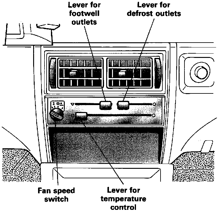 - The heating and ventilation controls are located in the center of the dashboard. The two upper levers control air distribution by regulating the opening of the defrost and footwell outlets. Air flow through dashboard vents can be controlled by operating the vents individually.