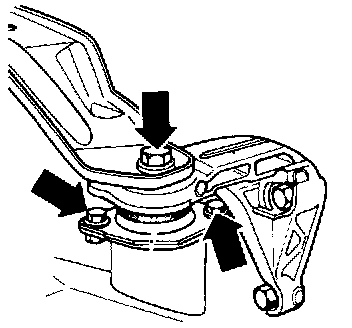 17. Remove the bolts from the rear engine mount and the transaxle mounting as shown. The rear engine mount is attached to passenger-side of subframe behind engine. Transaxle mount is attached to transaxle and left side subframe.