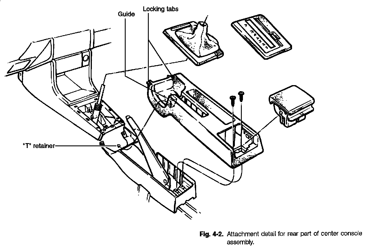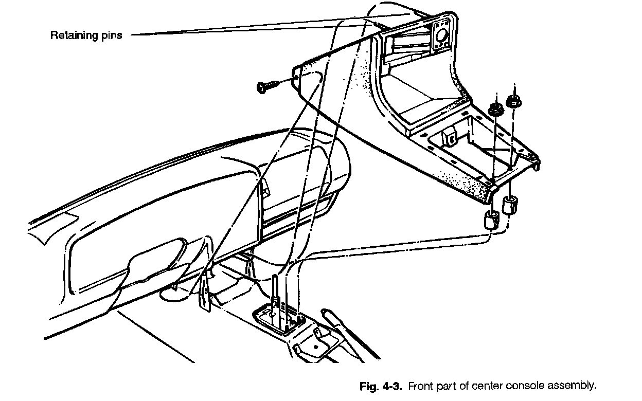 - The front part of the console is held in place by the nuts, screws and retainer pins as shown.