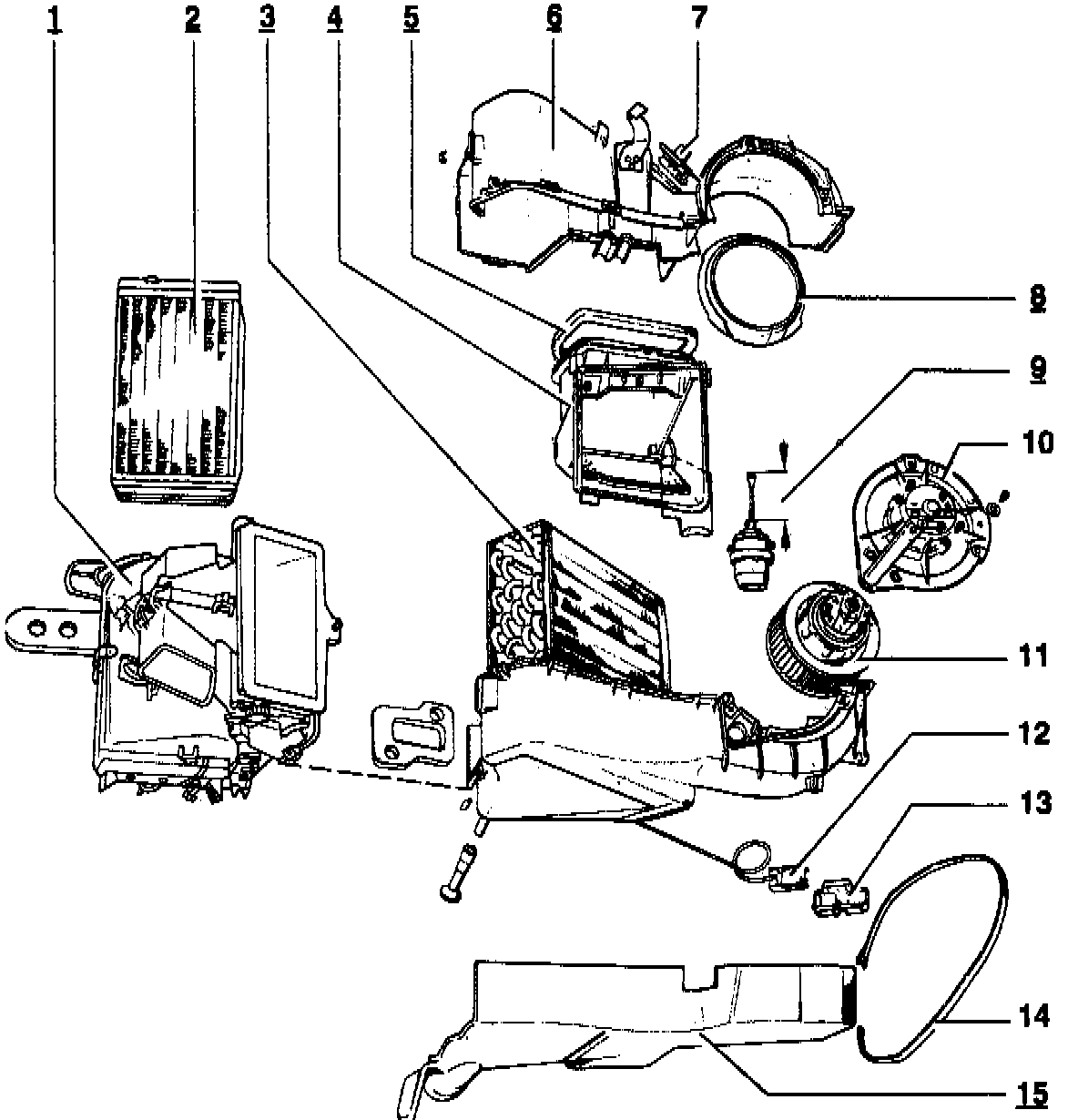 Remove air distribution and evaporator housing to replace components 1, 2, 3, 4, 5, 6, 8, 9, and 15 (identified with an *).