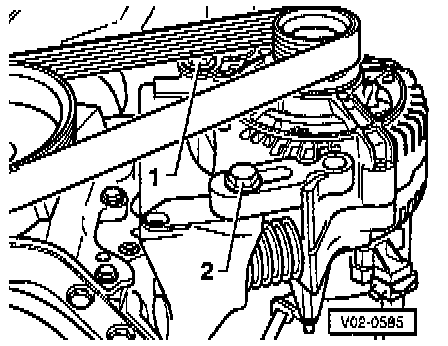 NOTE: On engines with a tensioning pulley the tensioning of the ribbed drive belt is not required, as the spring loaded tensioning system ensures the correct belt tension.1. Loosen alternator securing bolts -1- and -2- at least one turn.