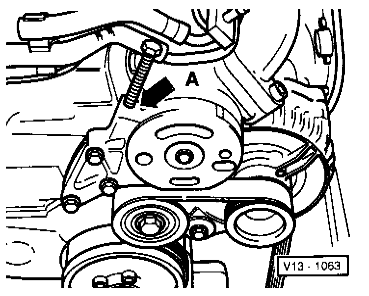 Screw in bolt M8 X 80 into threaded hole -A- until tension of poly-ribbed belt is released.