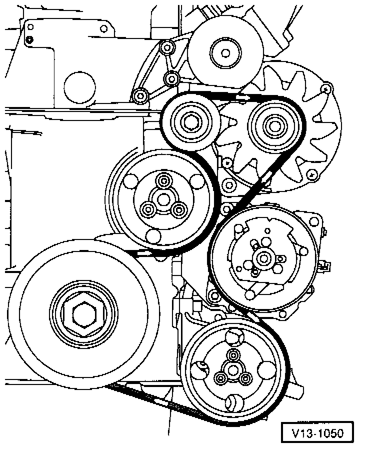 Poly-ribbed belt, 6 cylinder engine, removing/installingNOTE: When installing the poly-ribbed belt be sure it is properly seated on the pulley.