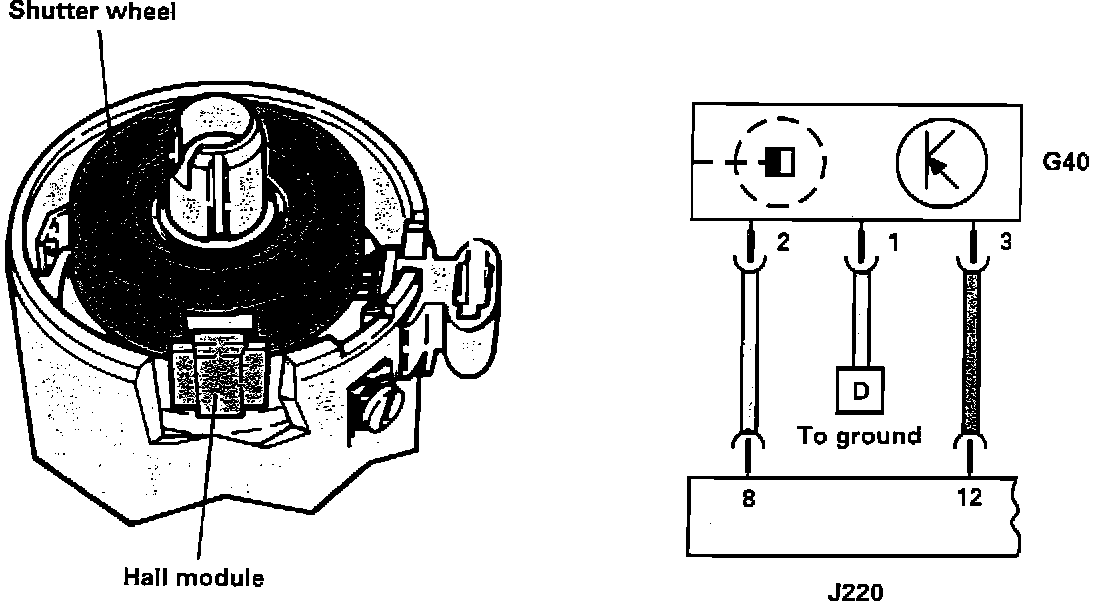 The distributor consists of the housing and distributor shaft. The distributor shaft is located in the center of the housing. The shaft is in permanent connection with a camshaft in the cylinder head and rotates at half the speed of the crankshaft.