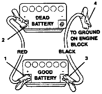 4- Other end of negative cable -black- to engine block -4- of car with dead battery.