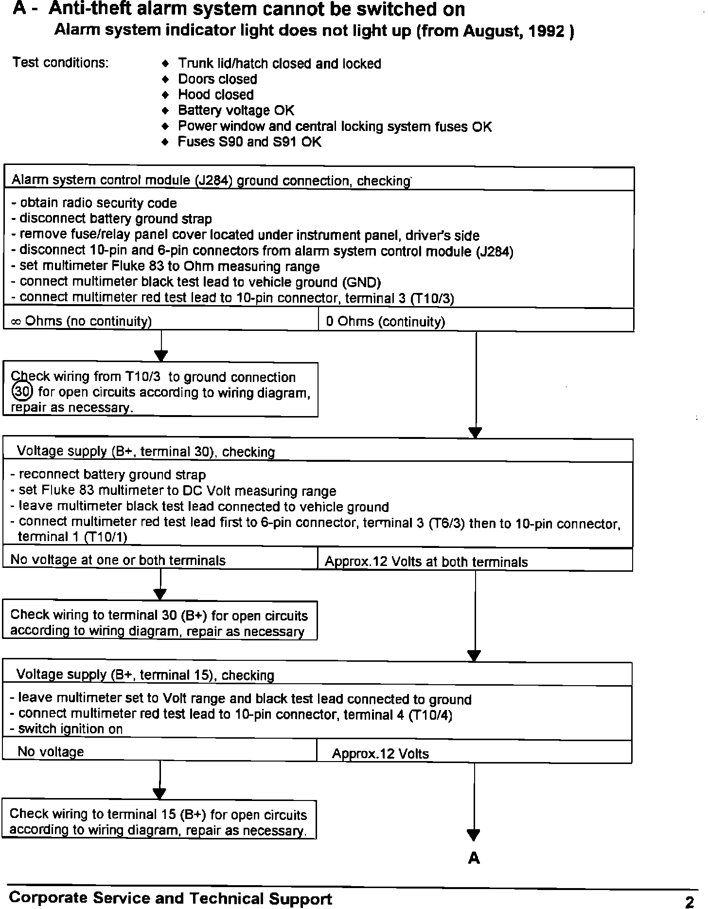 A - Anti-theft alarm system cannot be switched on; Alarm system indicator light does not light up (from August, 1992)