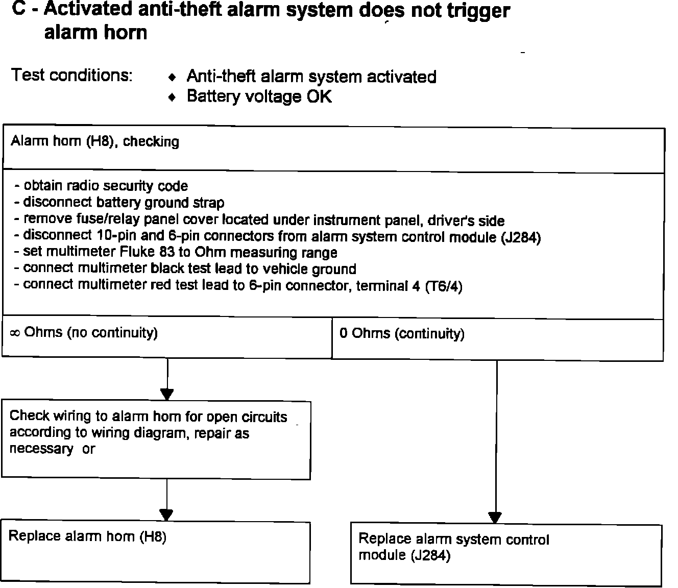 C - Activated anti-theft alarm system does not trigger alarm horn
