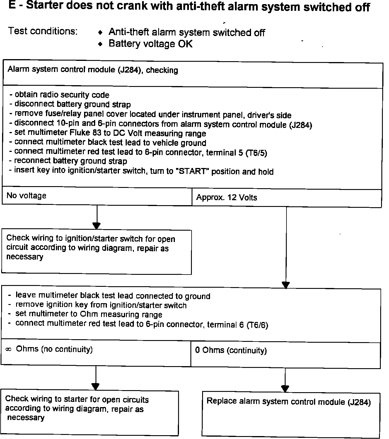 E - Starter does not crank with anti-theft alarm system switched off