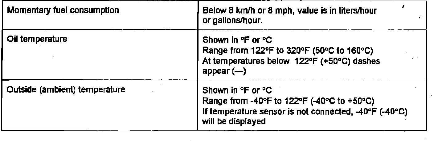 The value for momentary fuel consumption appears in the display. Press and release mode select switch (E 86) to call up oil temperature, then outside air (ambient) temperature. The selected function appears in the display. The data in the display is aligned on the right hand side.