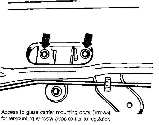 1. Mount the glass carrier to the window regulator. Install the bolts snugly, but not fully tight.