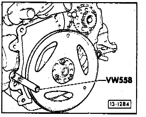 - fasten flywheel/driving plate to the crankshaft with at least 3 bolts and lock in place with holding tool VW 558