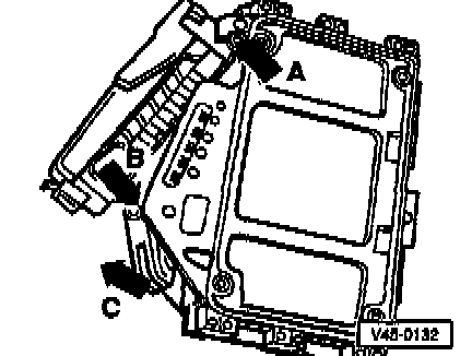 - Engage connector catch in control module slots (arrow A), press connector on (arrow B) and secure with locking bar (arrow C).
