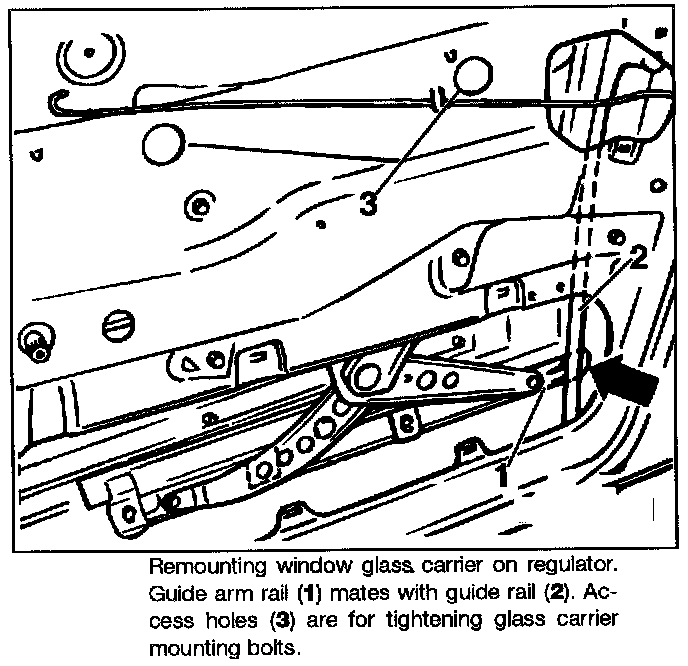 2. Remove the two bolts that mount the window glass carrier to the window regulator.