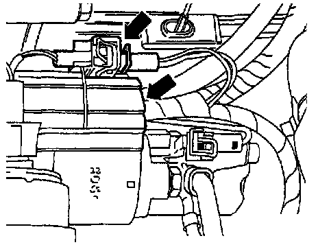 - Unlatch connector at solenoid terminal 50 -upper arrow- and disconnect.