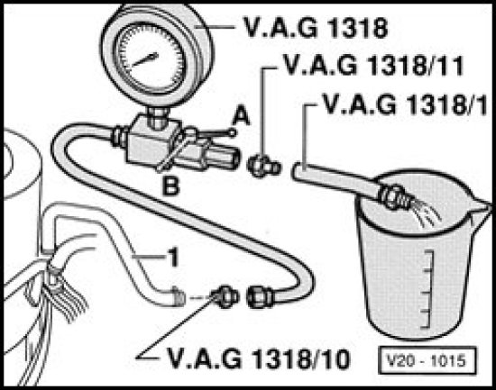 - Connect pressure gauge (V.A.G 1318) with adapter (V.A.G 1318/10) to fuel supply line -1-.