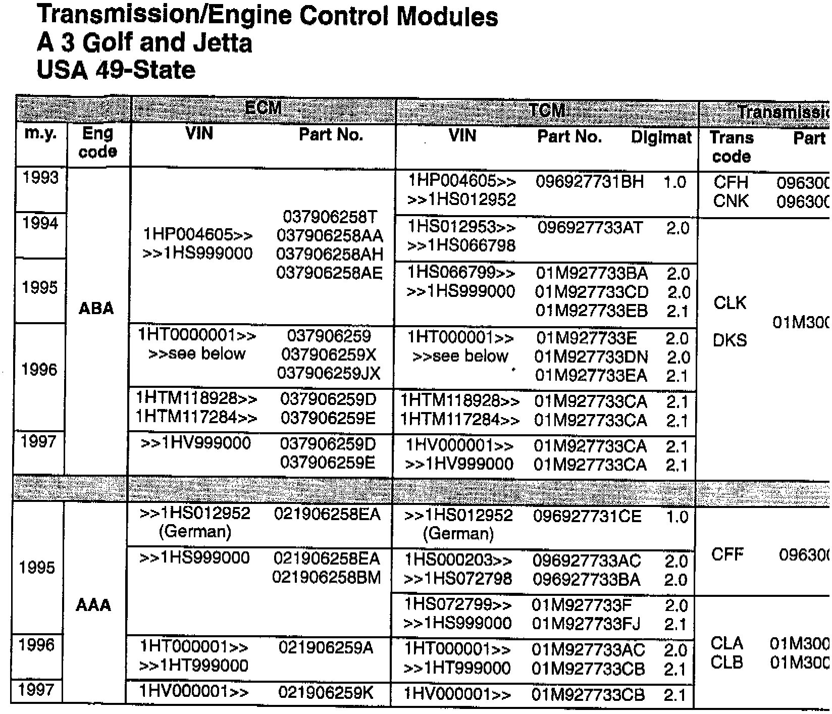 Golf, Jetta, Cabrio 49-State 1993 -->