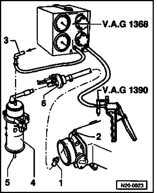 - Disconnect purge hose -1- from EVAP canister purge regulator valve -6- and install VAG 1390 (or US8026 hand vacuum pump) to hose.