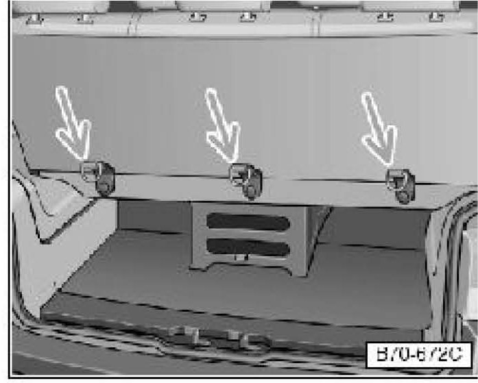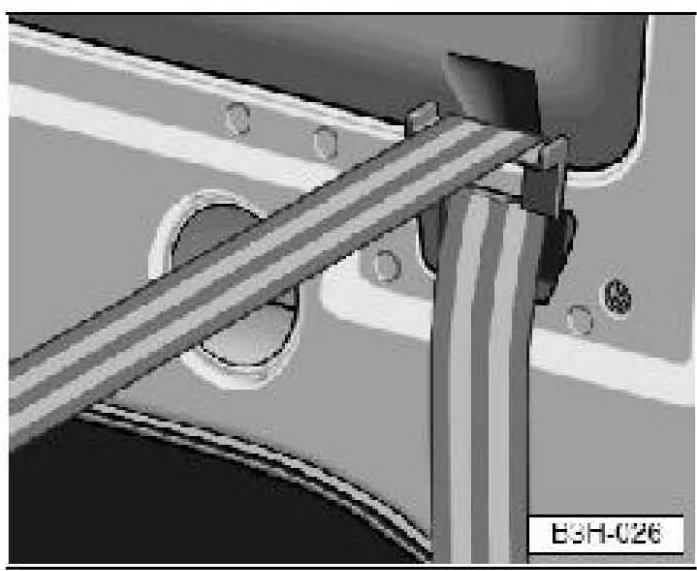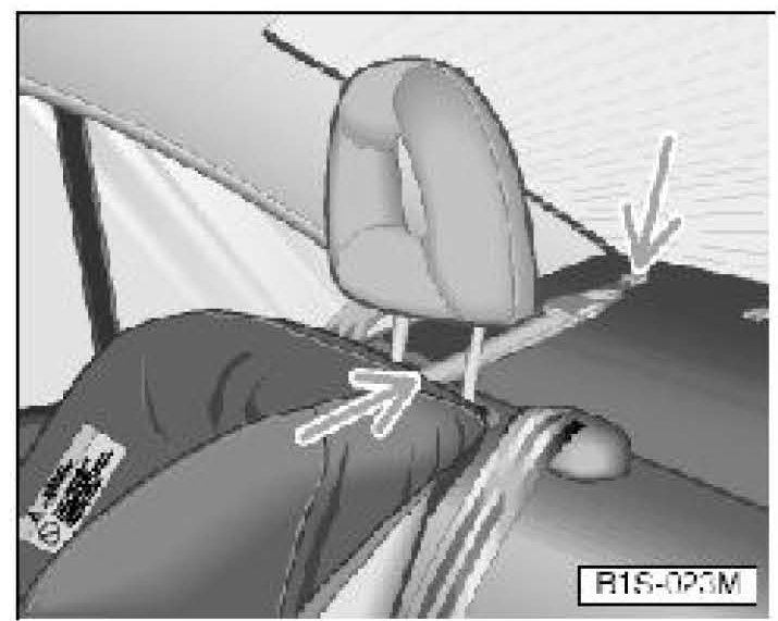 Guide tether strap under rear seat head restraints through guide as shown, and route to tether anchors in luggage compartment of Cabrio.