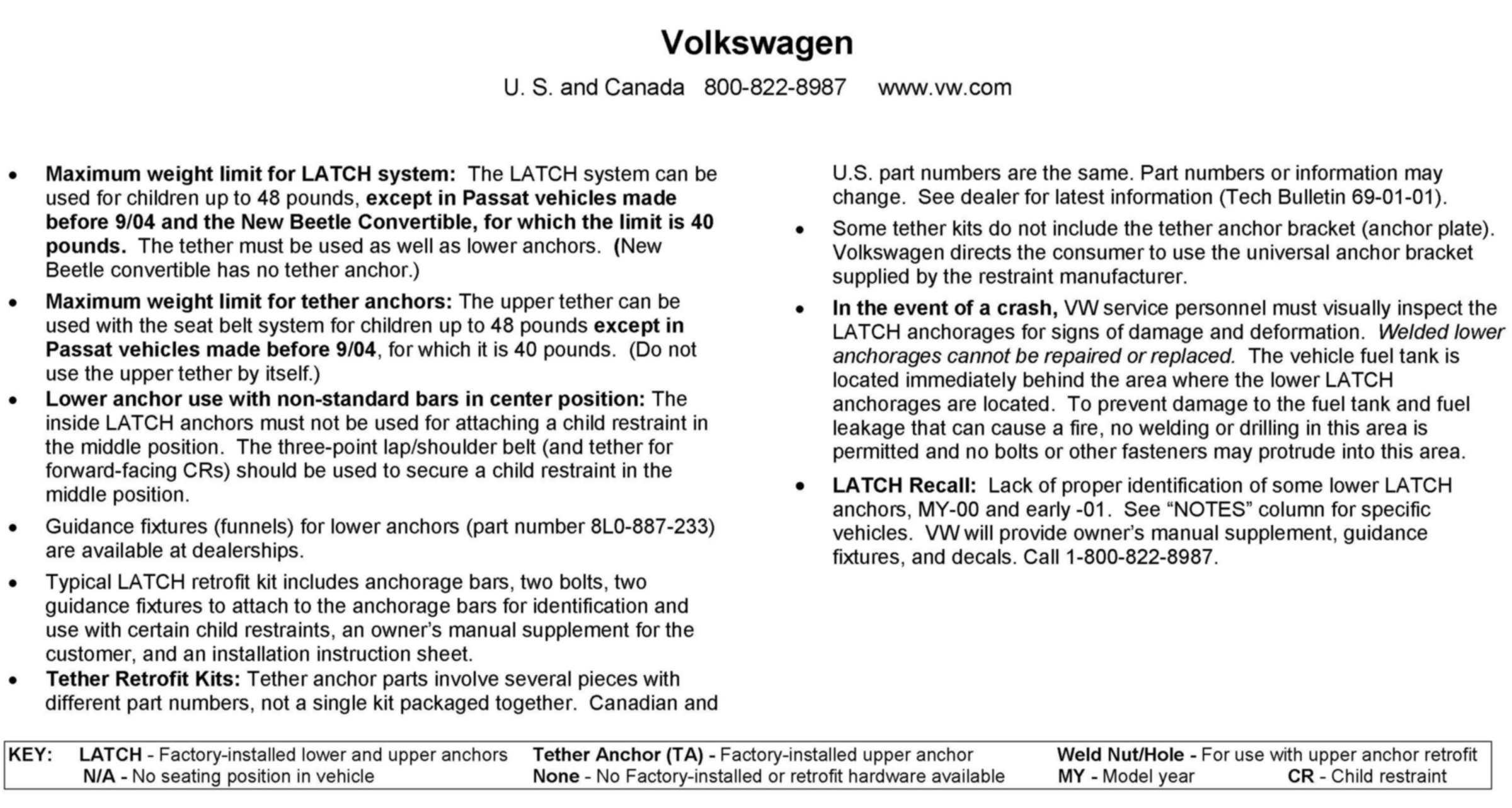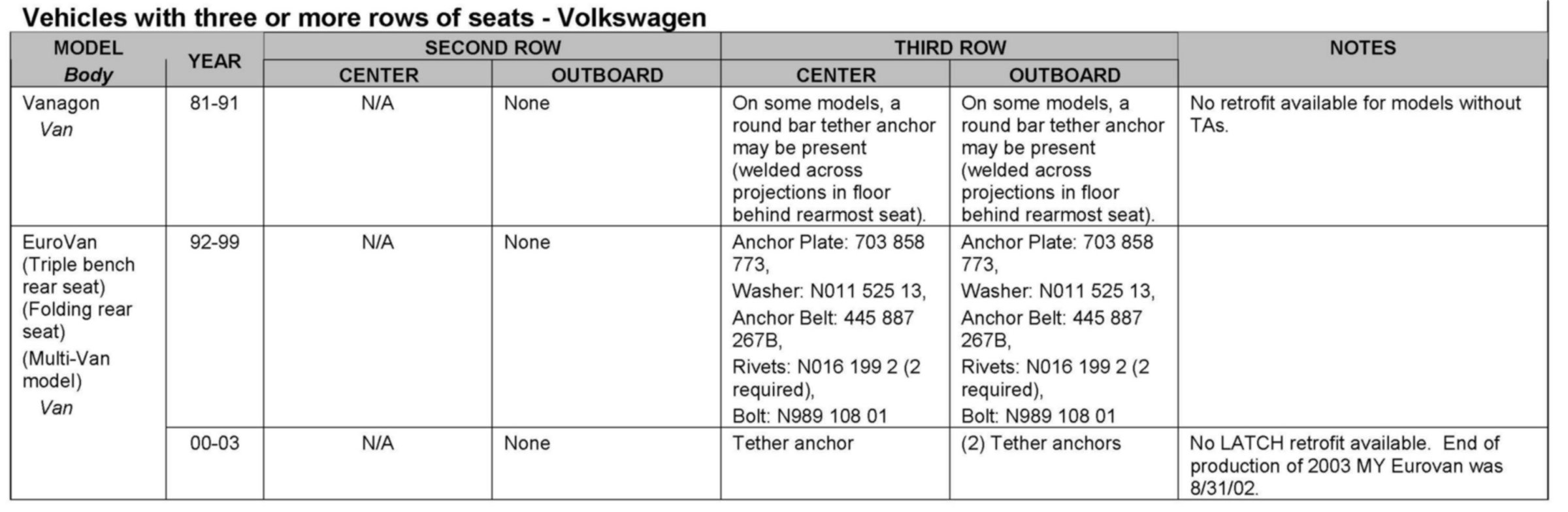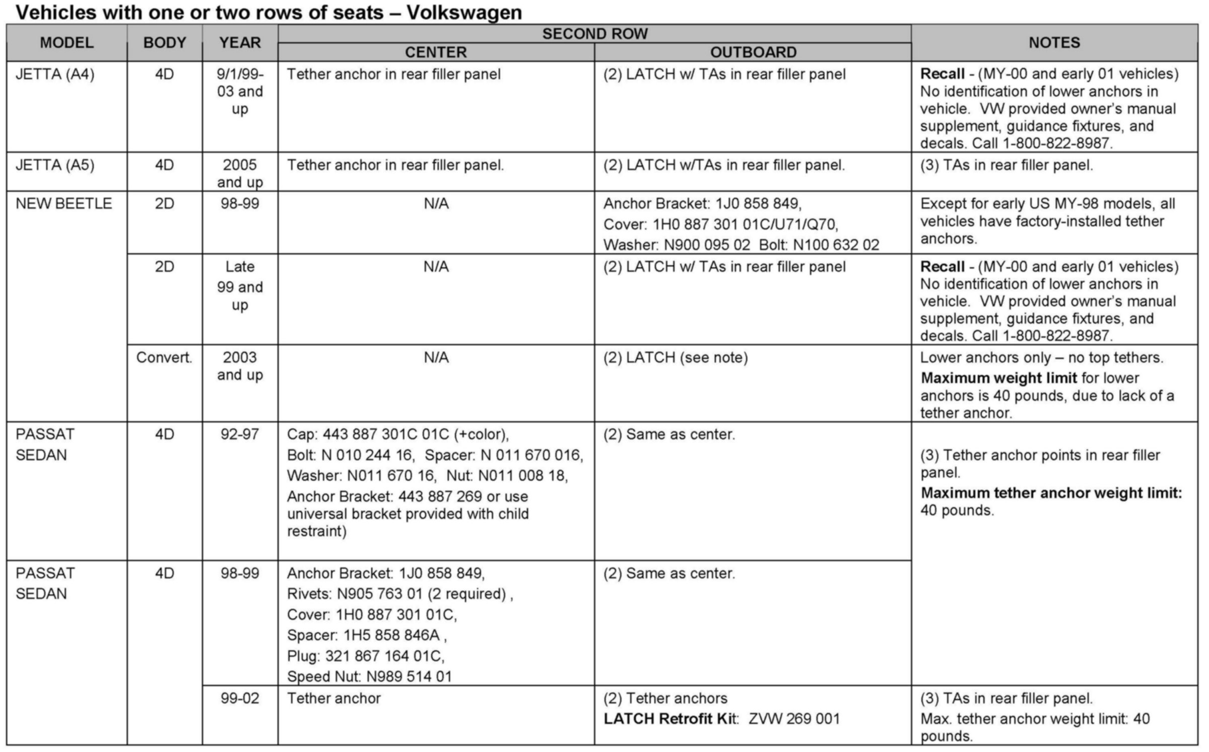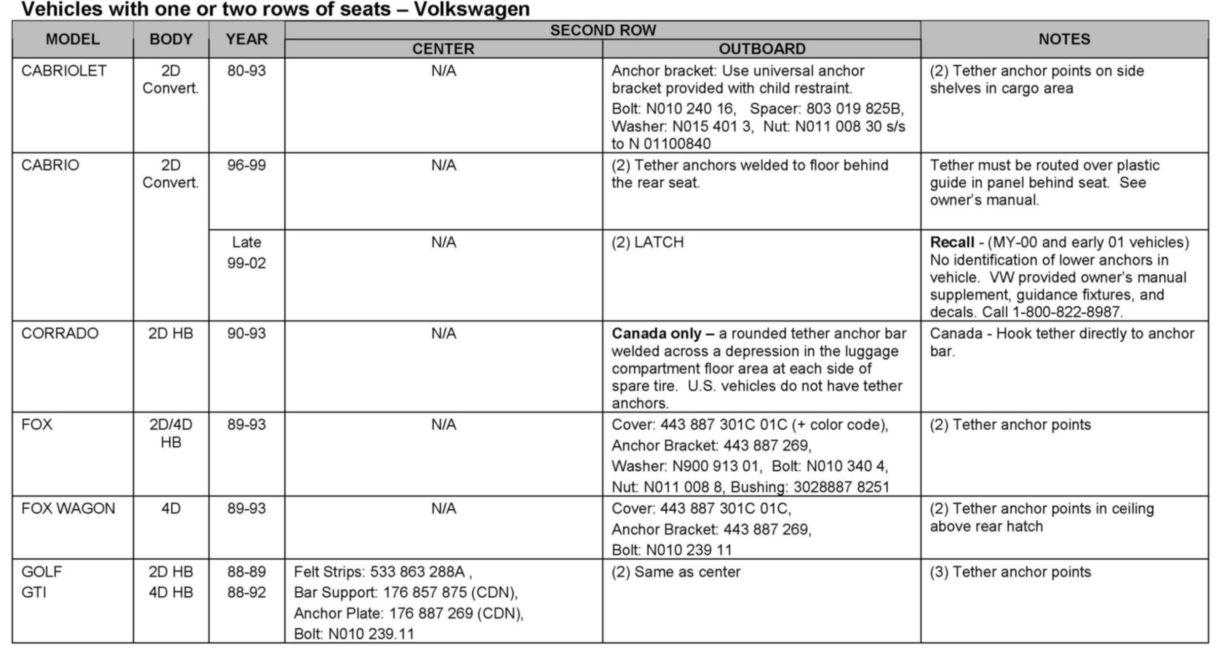 Some Golf and Passat Wagon models may require a seat back change for tether anchor installation.