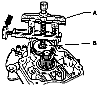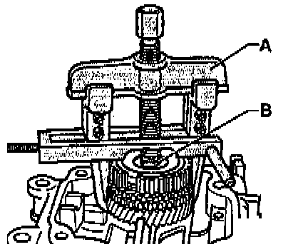 - Remove bolts -A- for synchro-hub and 5th gear.