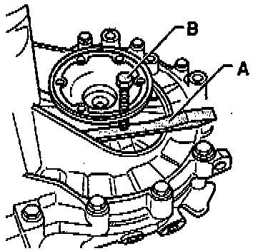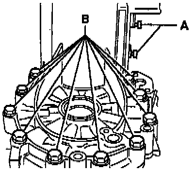 - Remove bolts -B- attaching clutch housing to transmission housing in area of differential.