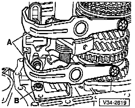 - Remove cover plate -A- and shift fork pivot pins -B from underside of transmission.