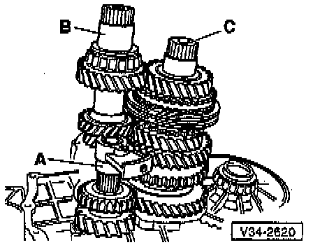 - Remove reverse gear -A-, input shaft -B- and output shaft -C-, in that order, from clutch housing.