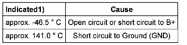 1) If a temperature is indicated which is below the ambient temperature of sensor, first check sensor wires for contact resistance. Note that while the vehicle is standing still the sensor might warm up due to radiant heat.