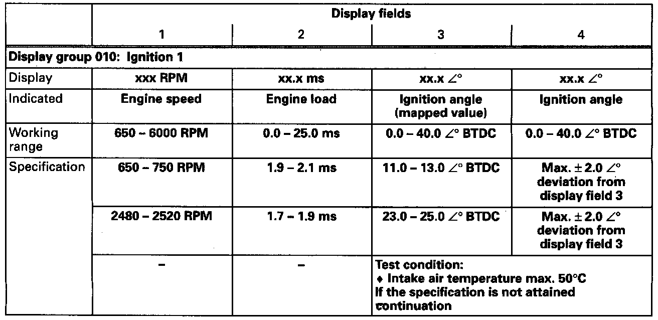 - Check the ignition timing control specifications (display fields 1-4).