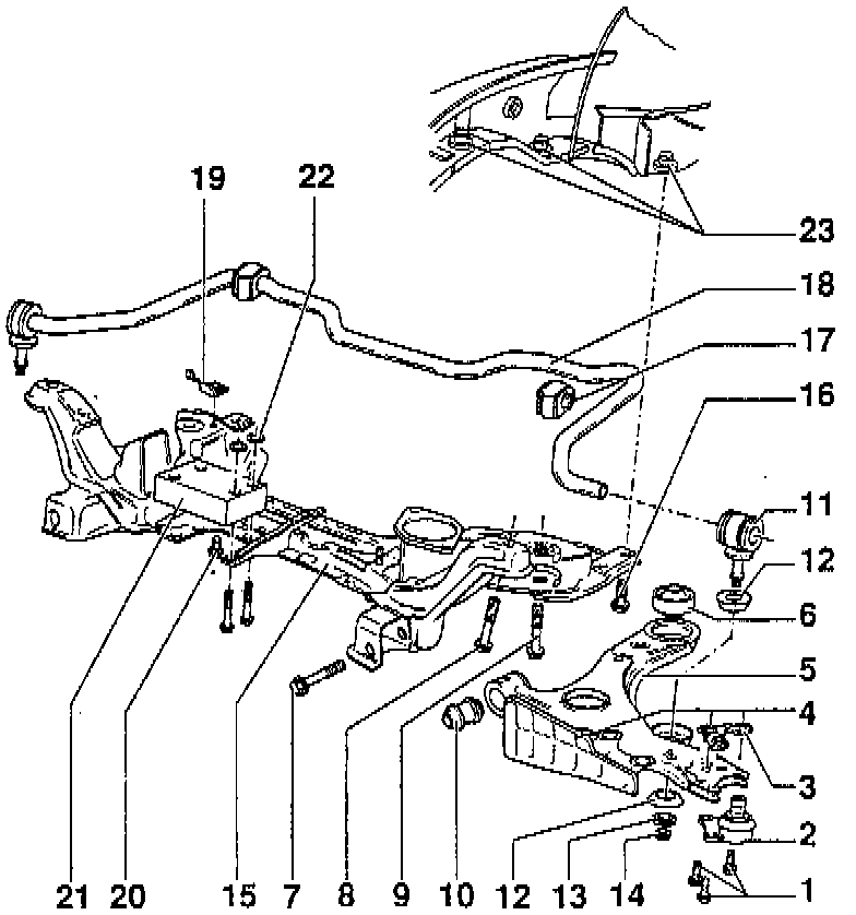 - Remove sub-frame from below with support tool No. VAG 1383, or equivalent, (with control arm but without steering gear).