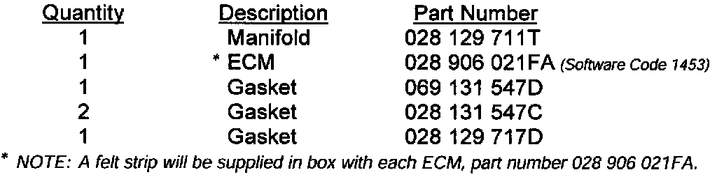 The following parts are required for this updating program of which an initial supply will automatically be shipped to you according to your vehicle allocation
