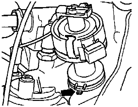 - Install distributor. The pins on the distributor must point toward mounting bolt threaded hole (arrow)