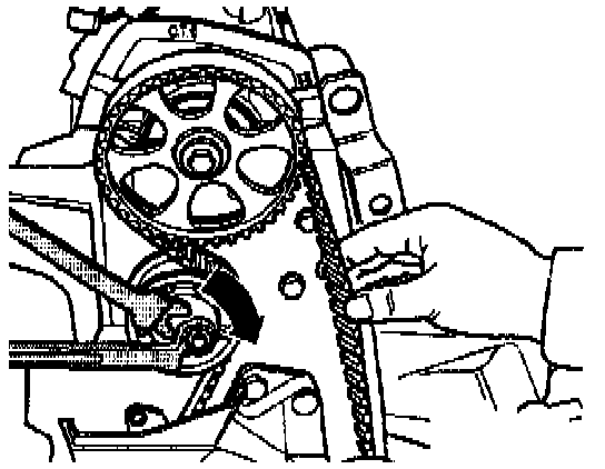 Drive belt is correctly tensioned if it can be turned 90° with the thumb and forefinger halfway between camshaft and intermediate shaft sprockets.