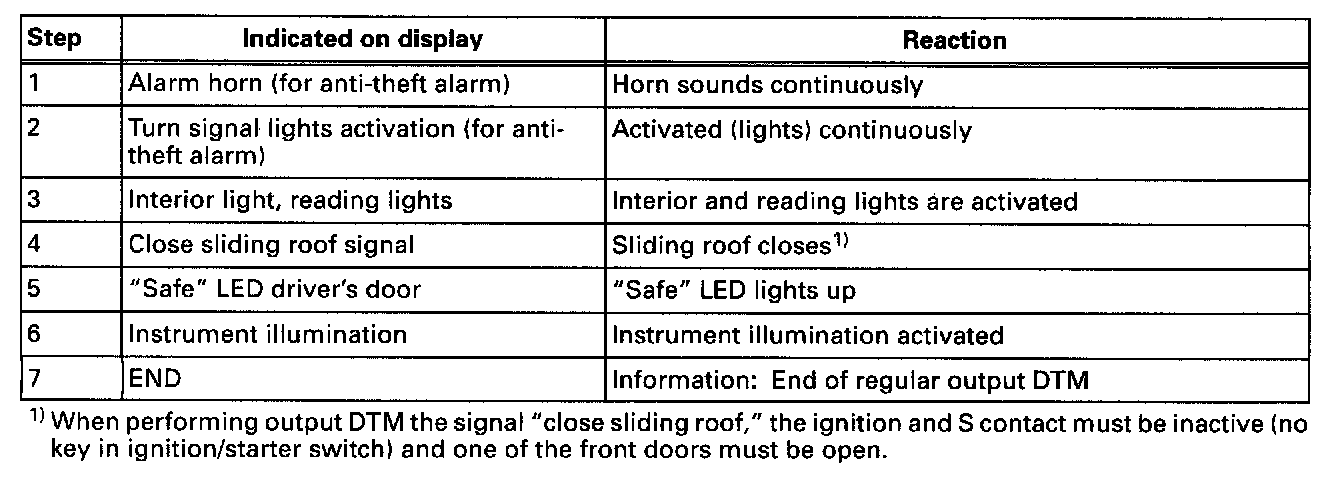 The components displayed in output Diagnostic Test Mode (DTM) can differ depending upon the equipment installed on the vehicle. For example, on vehicles without ATA there will be no "step 1" as listed in the table below.