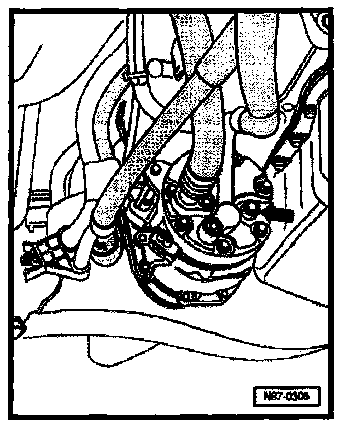 - Bridge contacts -1- and -2- with engine running. If A/C clutch -N25- switches on, refrigerant system may be empty. Refer to "A/C Refrigerant System, Testing With Pressure Gauges" Testing and Inspection
