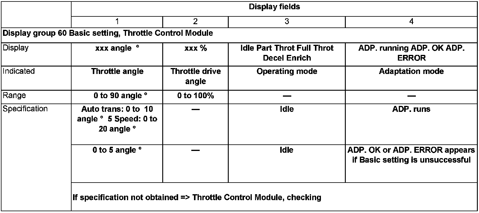 NOTE: After confirming Display group 60, adaptation is introduced and the Throttle drive is moved to the min., max. and emergency running positions. Then, using intermediate steps, a comparison is made between the Throttle Position sensor G69 and the G 187 Angle sensor 1 for Throttle drive.