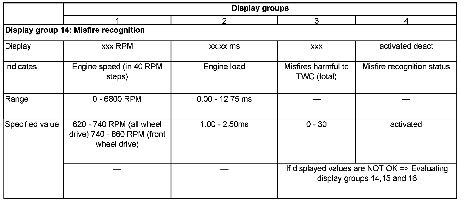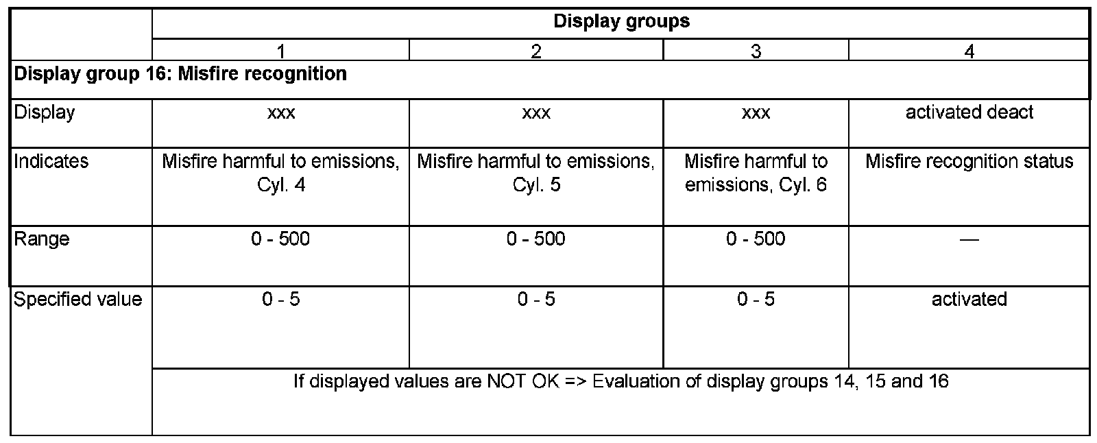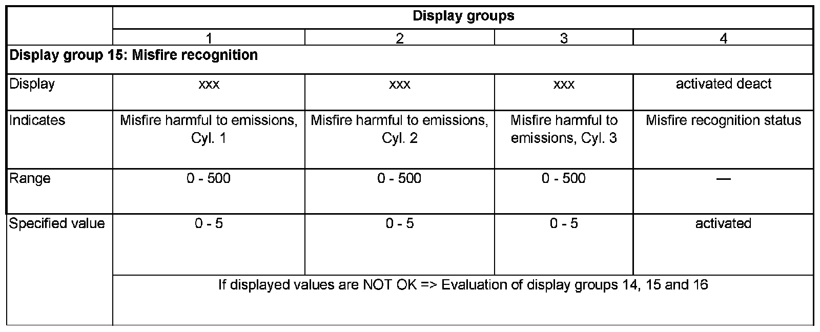 - Compare displayed values with specified values for misfire recognition (display fields 3-4):