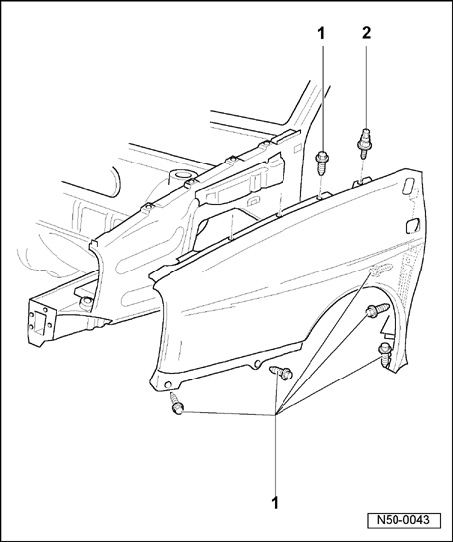 NOTE: When bolting fender in place, install zink packing AKL 381 035 50 or equivalent to each bolt contact area of wheel housing/A-pillar.