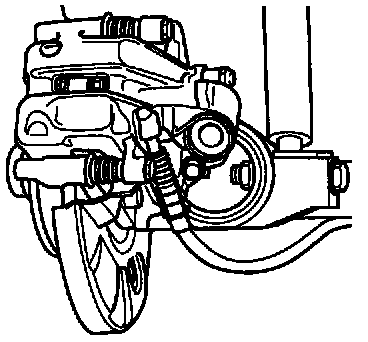 CAUTION: Do not allow the caliper to hang by the brake hose. The unsupported weight can stretch and damage the hose.