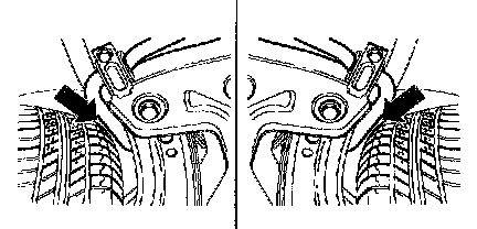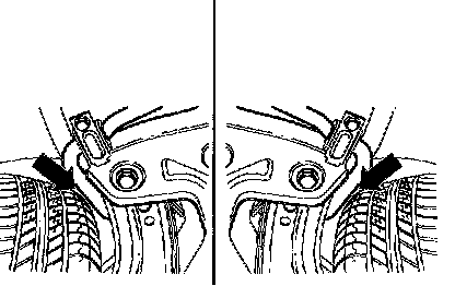 Distance between front axle components and tires (arrow) must be even at full lock (full turn left/right)