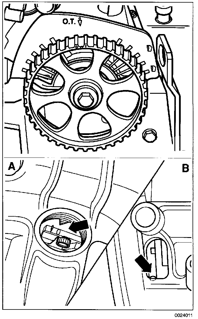 Check that the "OT" mark on camshaft sprocket aligns with "OT" mark on rear cover.