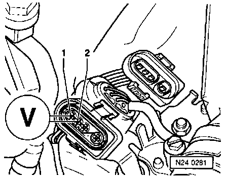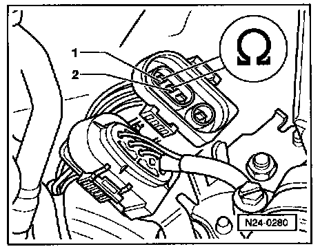- Connect multimeter with test leads from VW 1594 to measure resistance at terminals 1 and 2 on connector to HO2S.