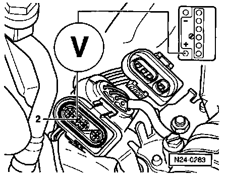 - Connect multimeter using test leads from VW 1594 between terminal 2 (ECM side of harness connector) and battery positive (B+).