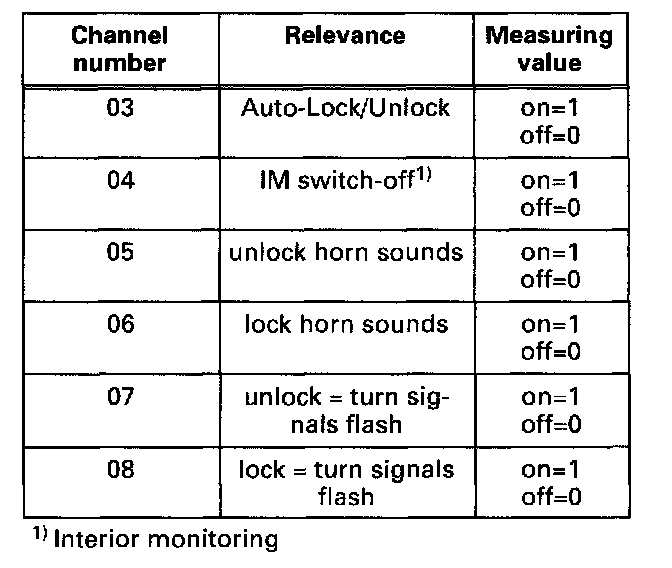 The various functions listed in the table can be called up and programmed to each ignition key in any combination by selecting the channel numbers 03 - 08.