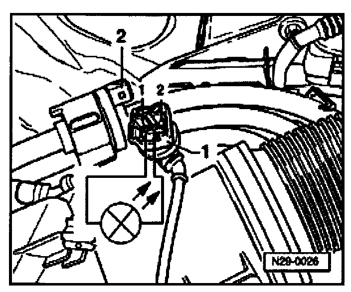 - Disconnect harness connector -1- from EVAP canister purge regulator valve -2- and connect VAG 1527 B voltage tester to harness connector using jumper wires from VW 1594 adaptor kit